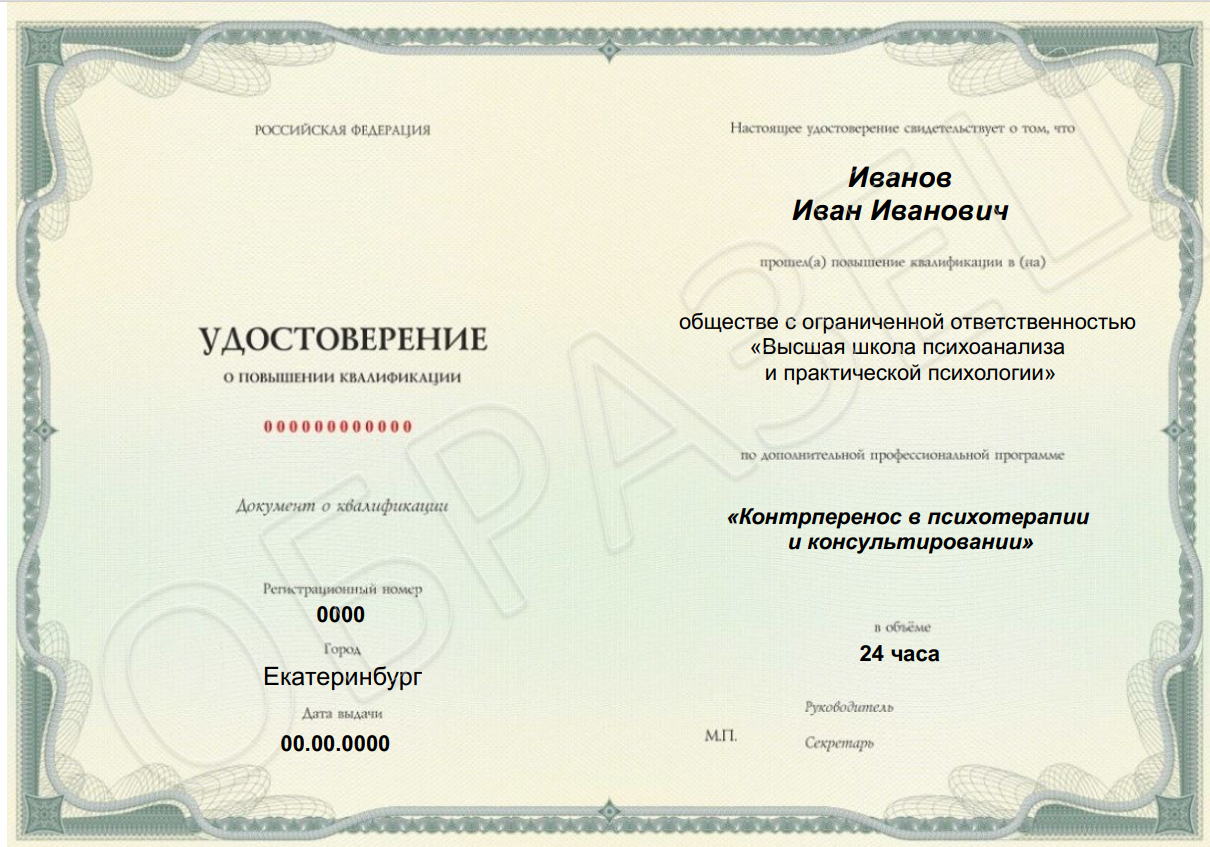 По итогам курса Анна получила удостоверение о повышении квалификации государственного образца (72 часа, регистрационный номер в ФИС ФРДО). Документ подтверждает её компетенции в области психодинамической диагностики и клинической практики.